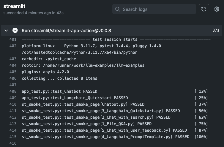 As a final working example example, take a look at our streamlit/llm-examples Actions, defined in this workflow file.